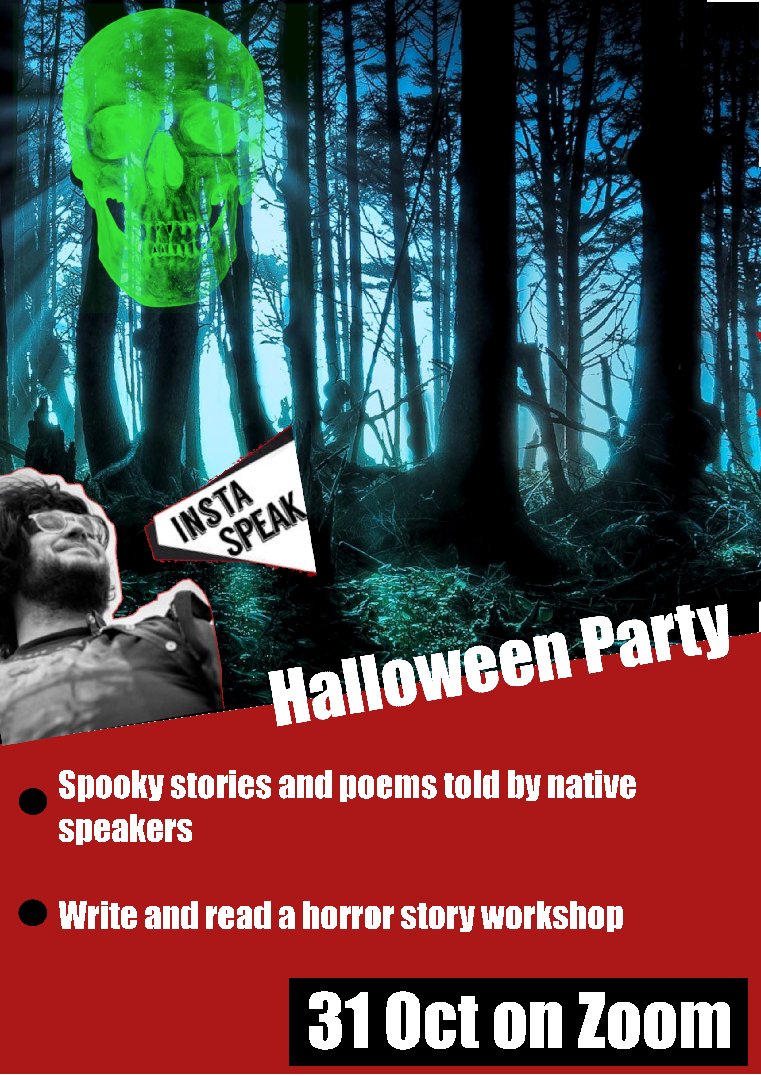 Halloween themed event on zoom with story reading, poetry performances and a writing workshop with native English writers and English teachers.